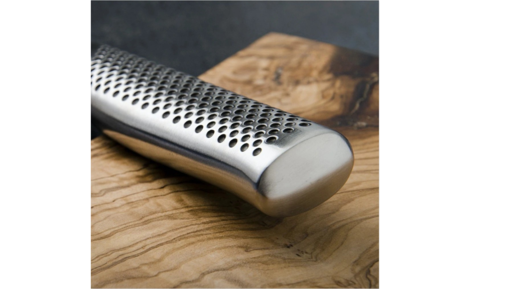 Khác với nhiều mẫu dao bếp truyền thống, Global G2 có thiết kế liền khối từ lưỡi đến cán. Cán dao rỗng và được cân bằng bằng vật liệu bên trong, giúp trọng lượng tổng thể nhẹ hơn nhưng vẫn giữ được độ ổn định khi cầm.