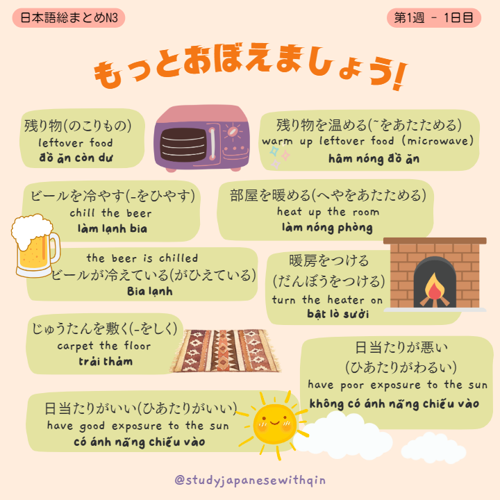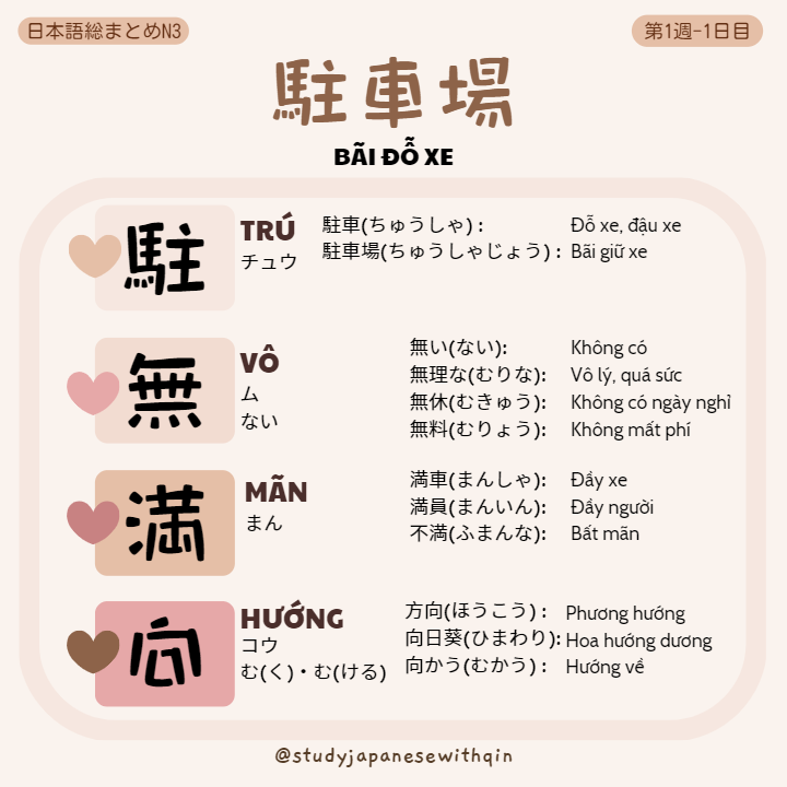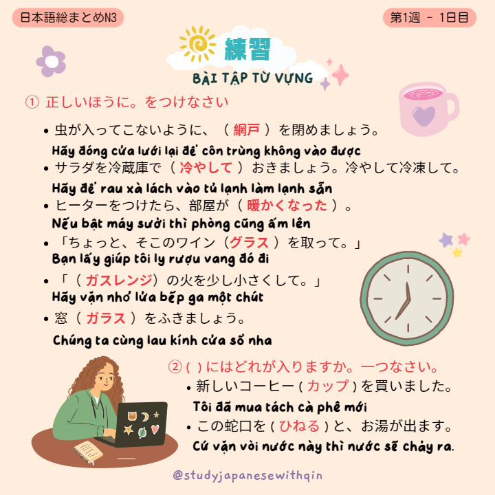 Xin chào! Đây là nội dung bài học của ngày 1 Tuần 1 trong bộ sách tiếng Nhật Nihongo soumatome N3 (日本語総まとめてN3). Bài học bao gồm từ vựng, hán tự, ngữ pháp và bài tập đi kèm của từng ngày. Mình sẽ bổ sung phần đọc hiểu và nghe hiểu sau khi tổng hợp hết từ vựng, hán tự và ngữ pháp nhé!